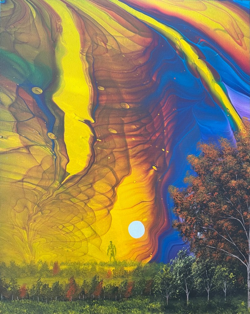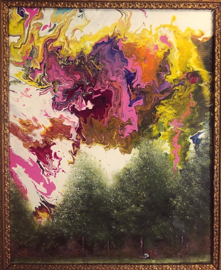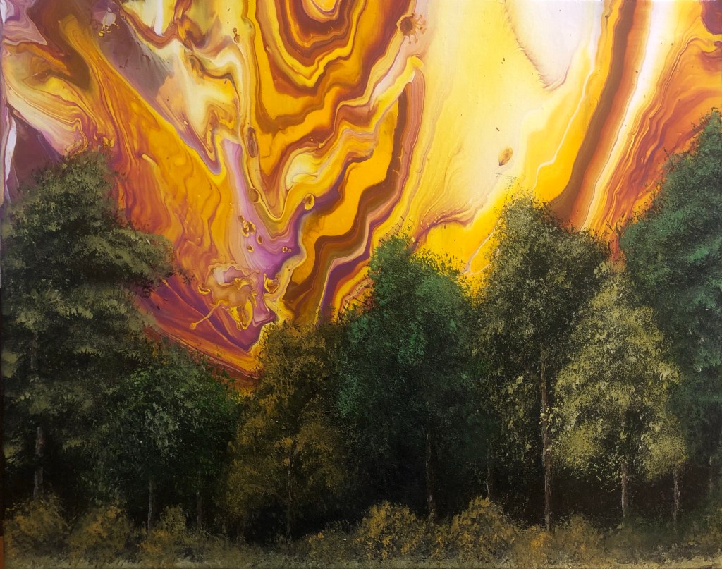 The yellow tracer around the canopy of the trees in graffiti is known as a force field. The composition of my landscapes are often not planned but revealed to me in the pouring process