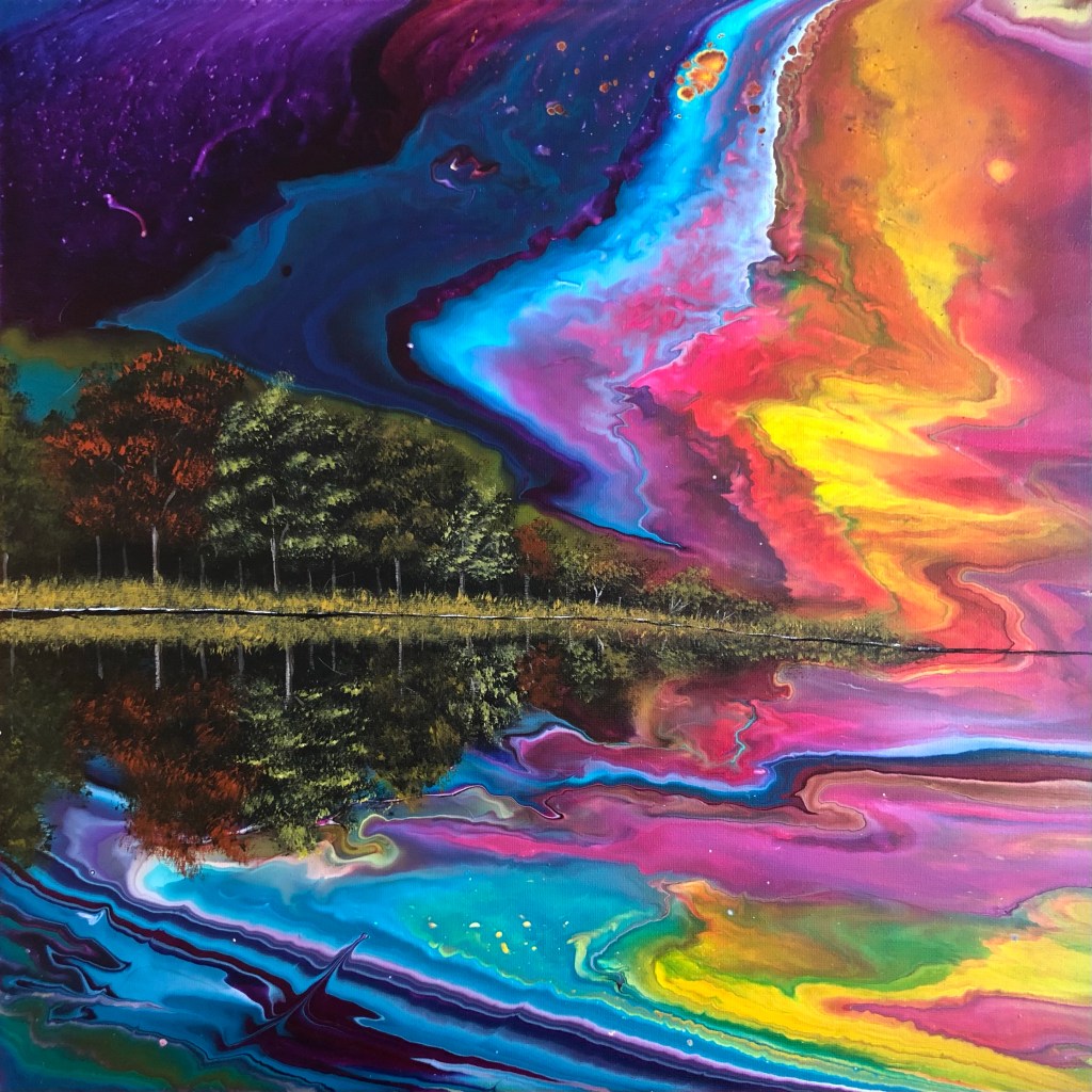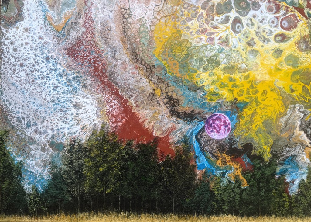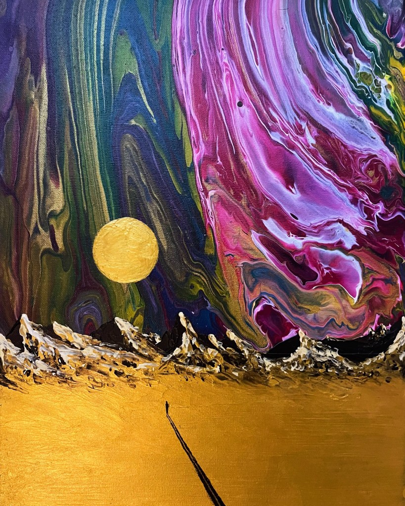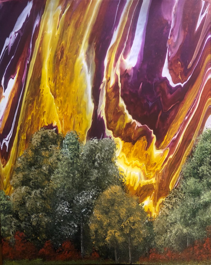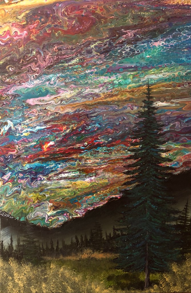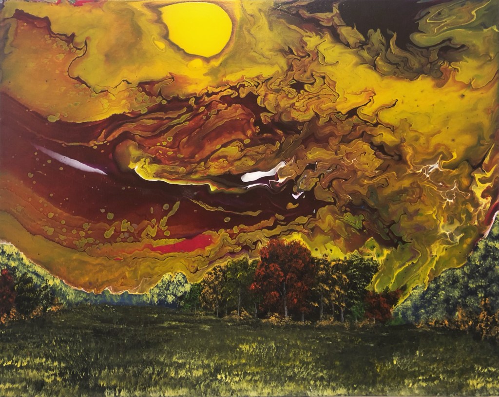 The entire composition of this landscape is shaped by following a bright yellow line that I saw during the pouring process.