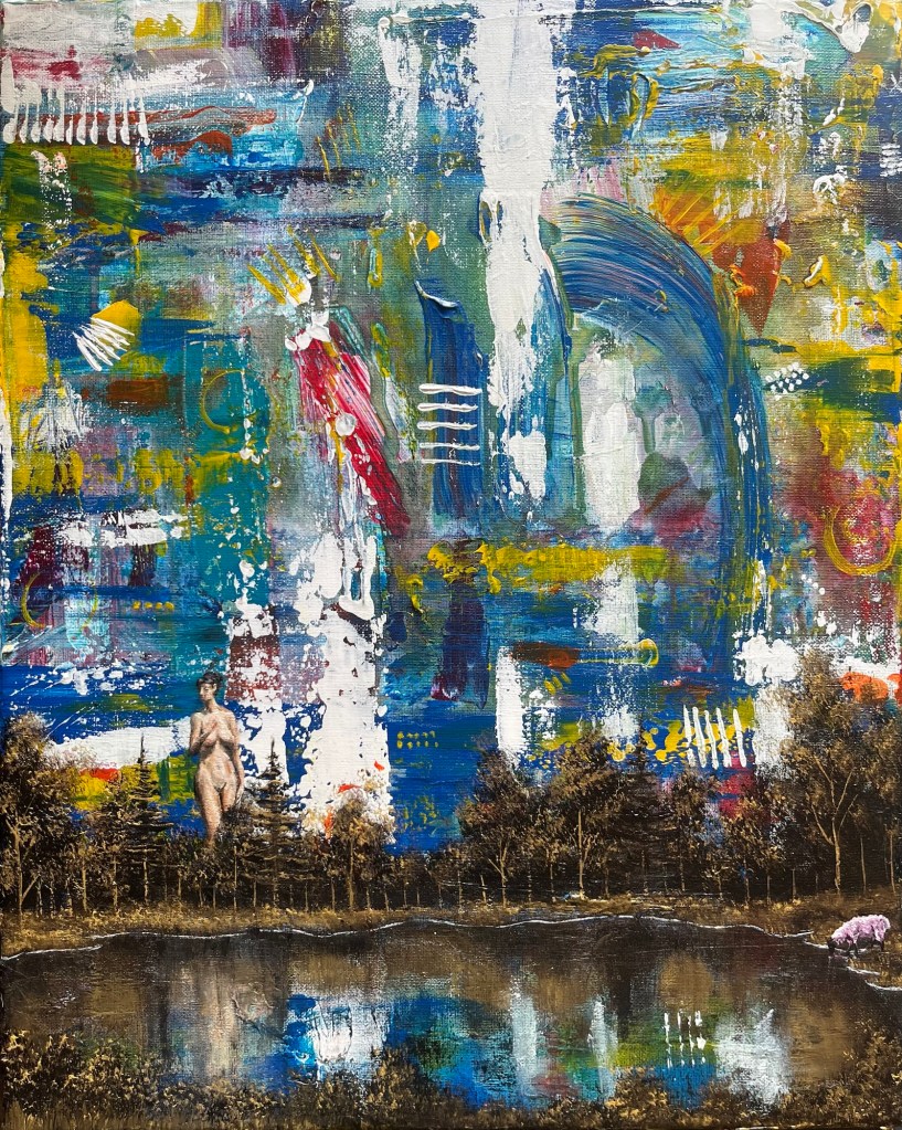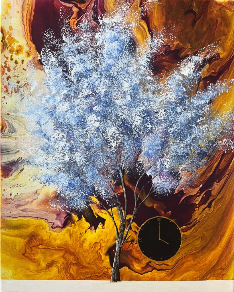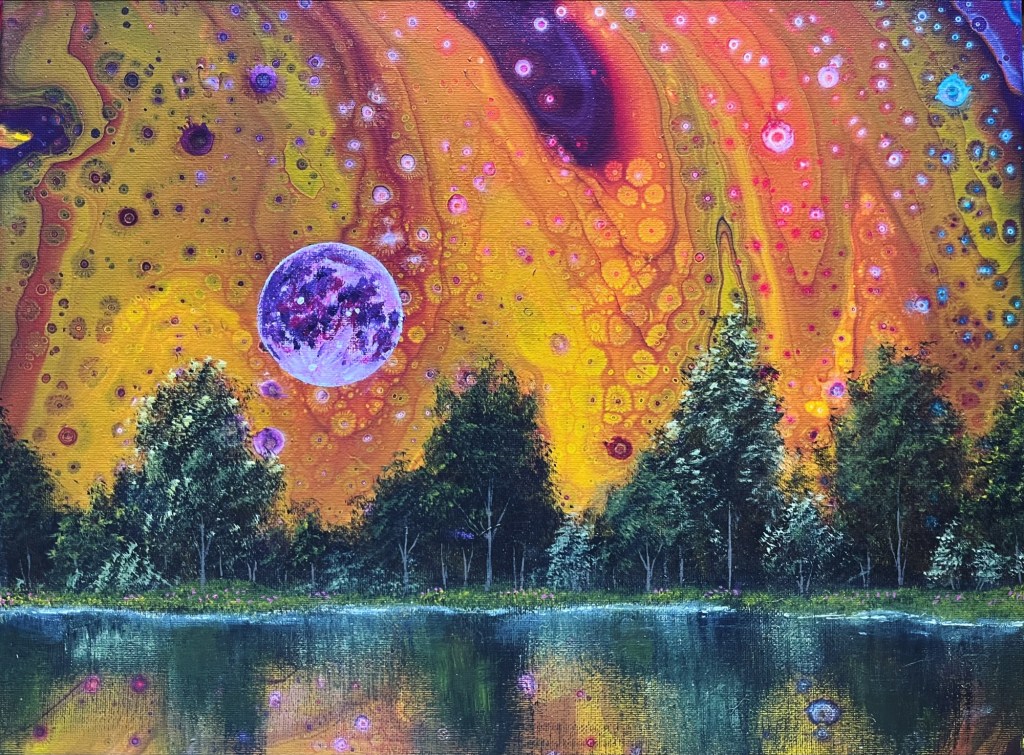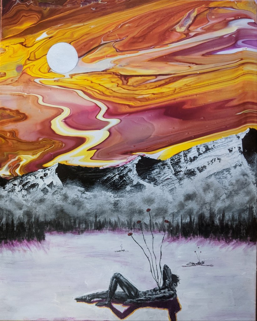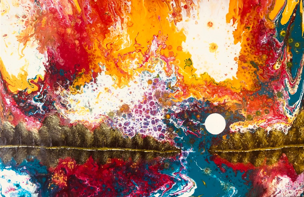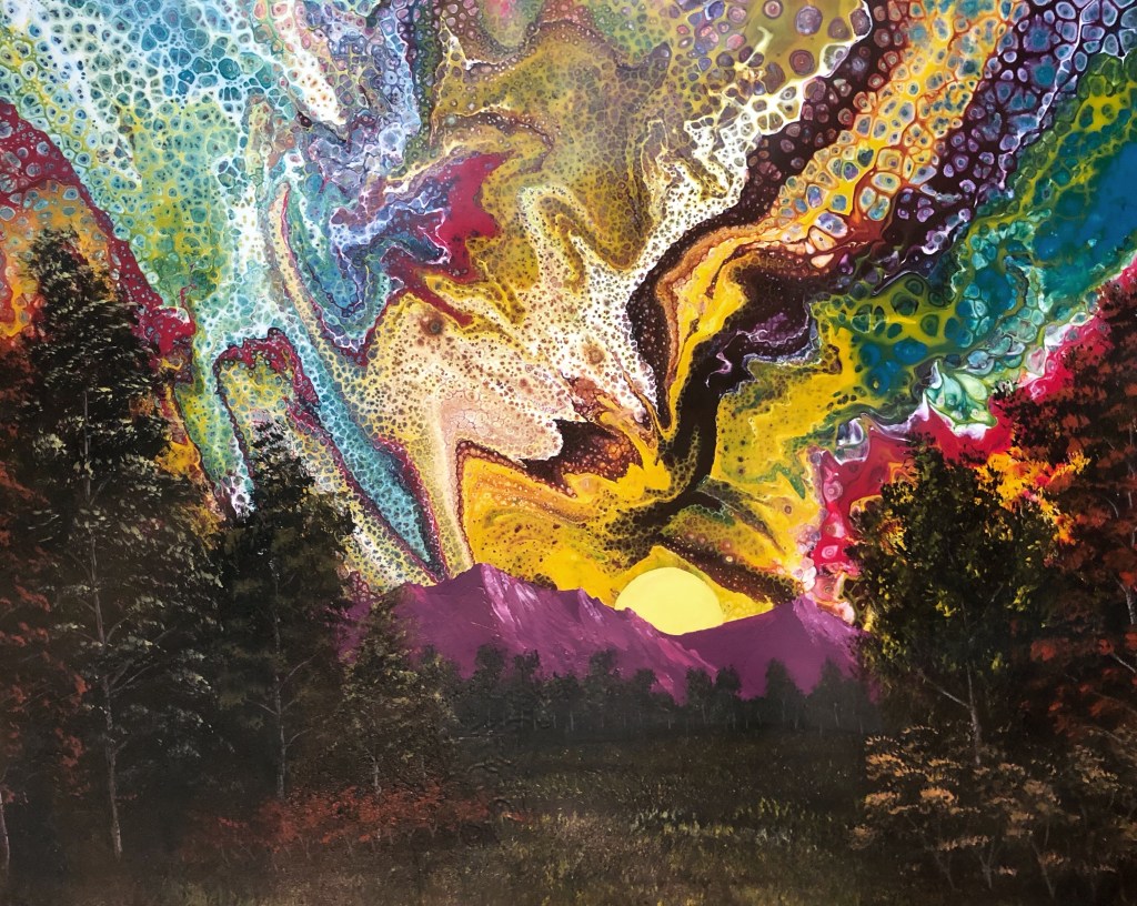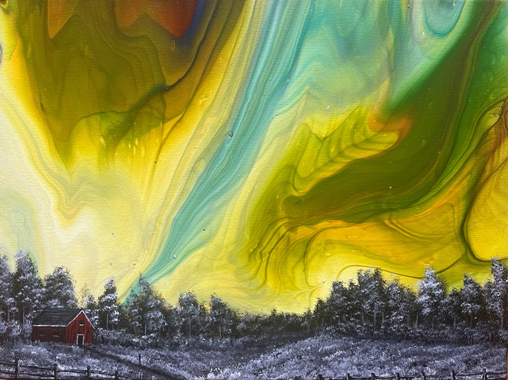 The entire composition of this landscape is shaped by following a bright yellow line that I saw during the pouring process.