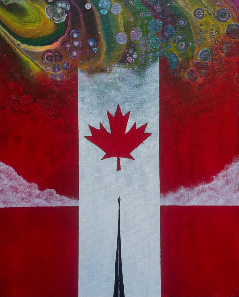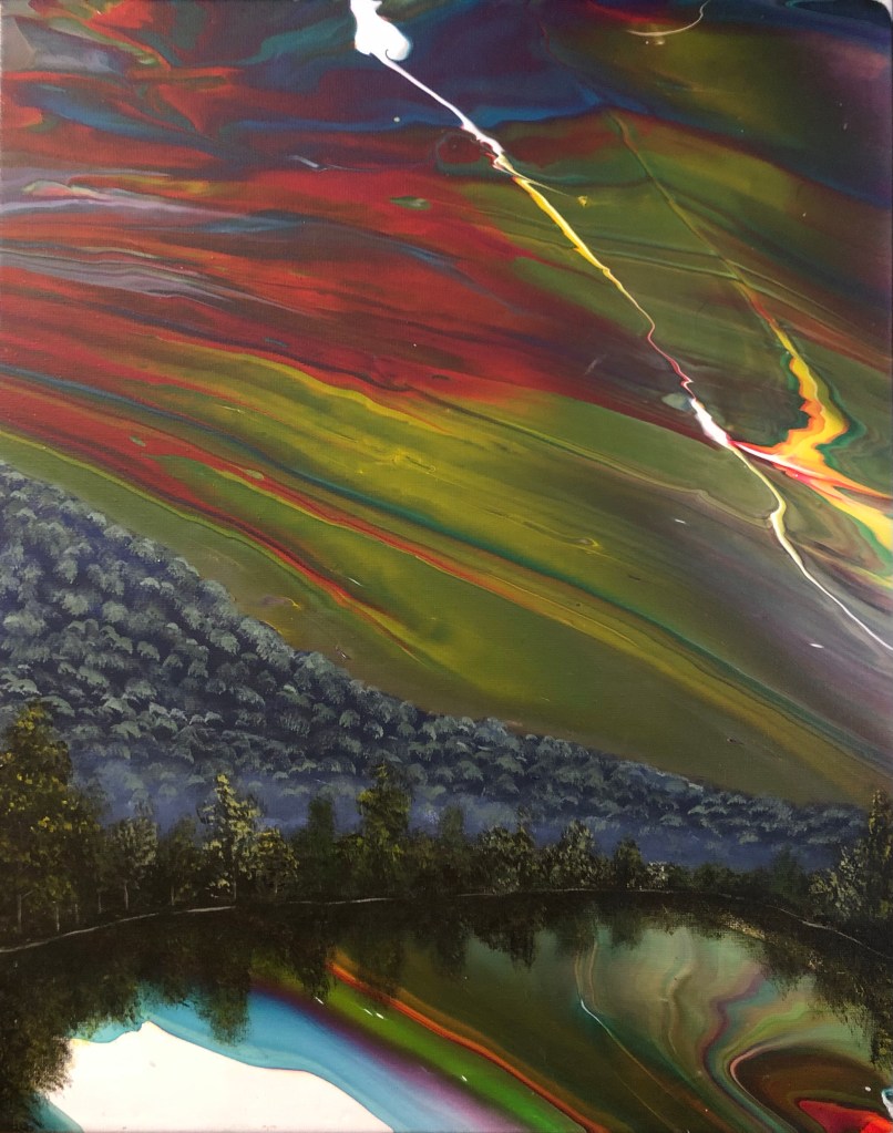 Painting is often a lone sport but in this process I am not alone. An assist from nature, like a sailor I can steer the ship but the wind propels it. I choose my colours, consistency, starting composition, direction of flow, and ultimately decide when it’s finished, but in the middle of it all I give up control to an external force “a negotiation with gravity” as an external force bleeds and bends things together and apart. During this negotiation, telltale details of colour, contrasts, and shapes reveal the composition of the landscape to me.