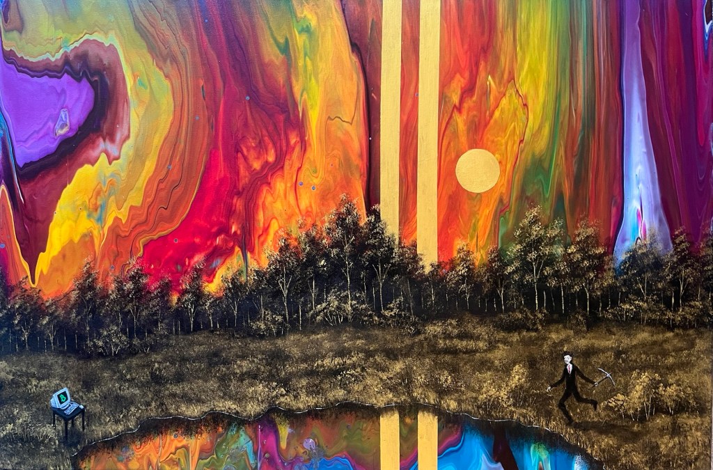 (A painting of a man in a suit with a pickaxe searching for bitcoin is observed in the wild)