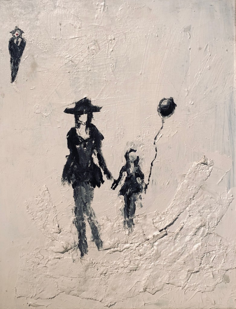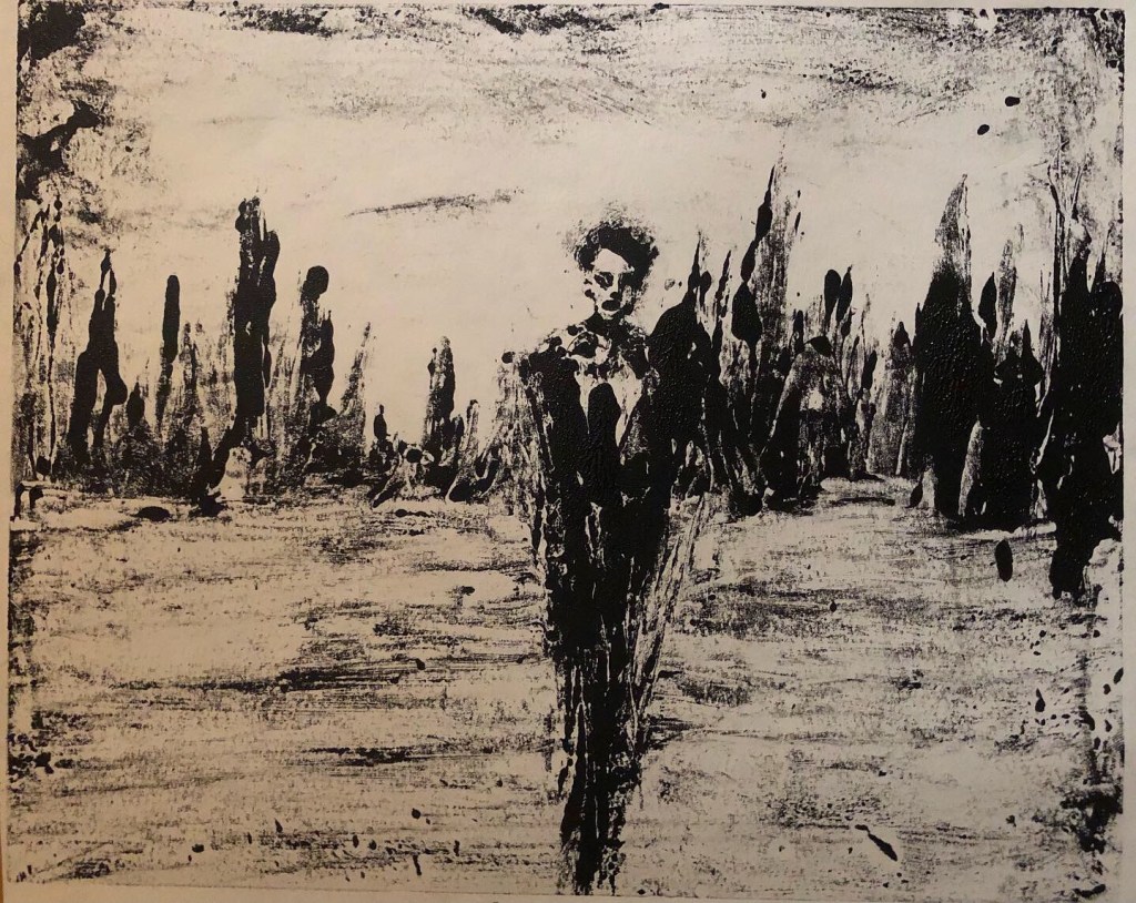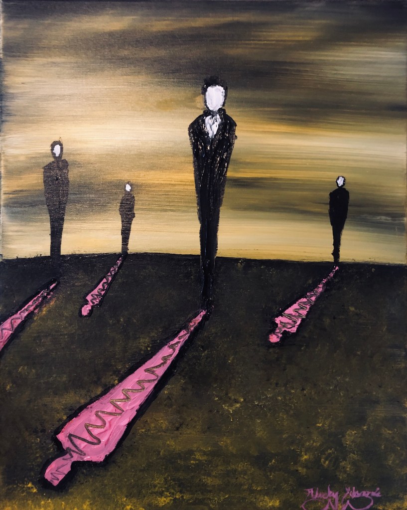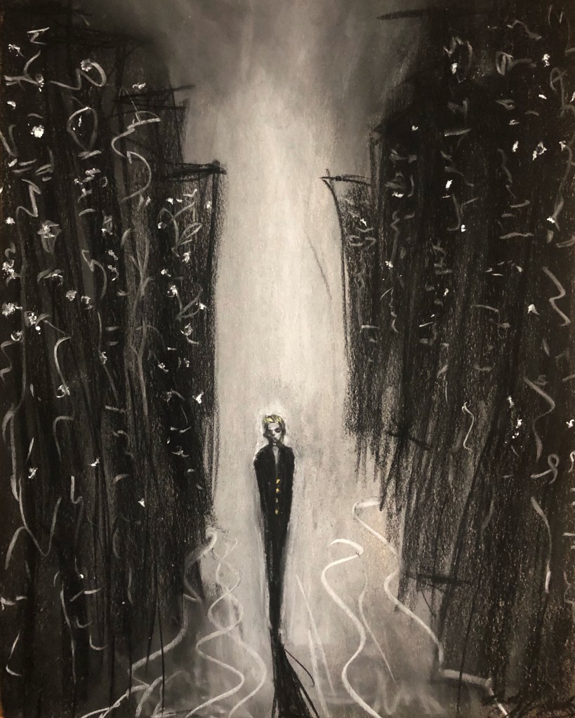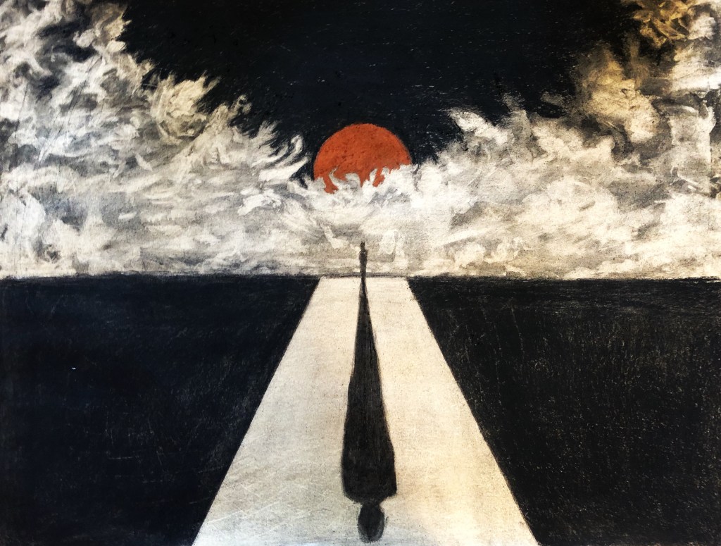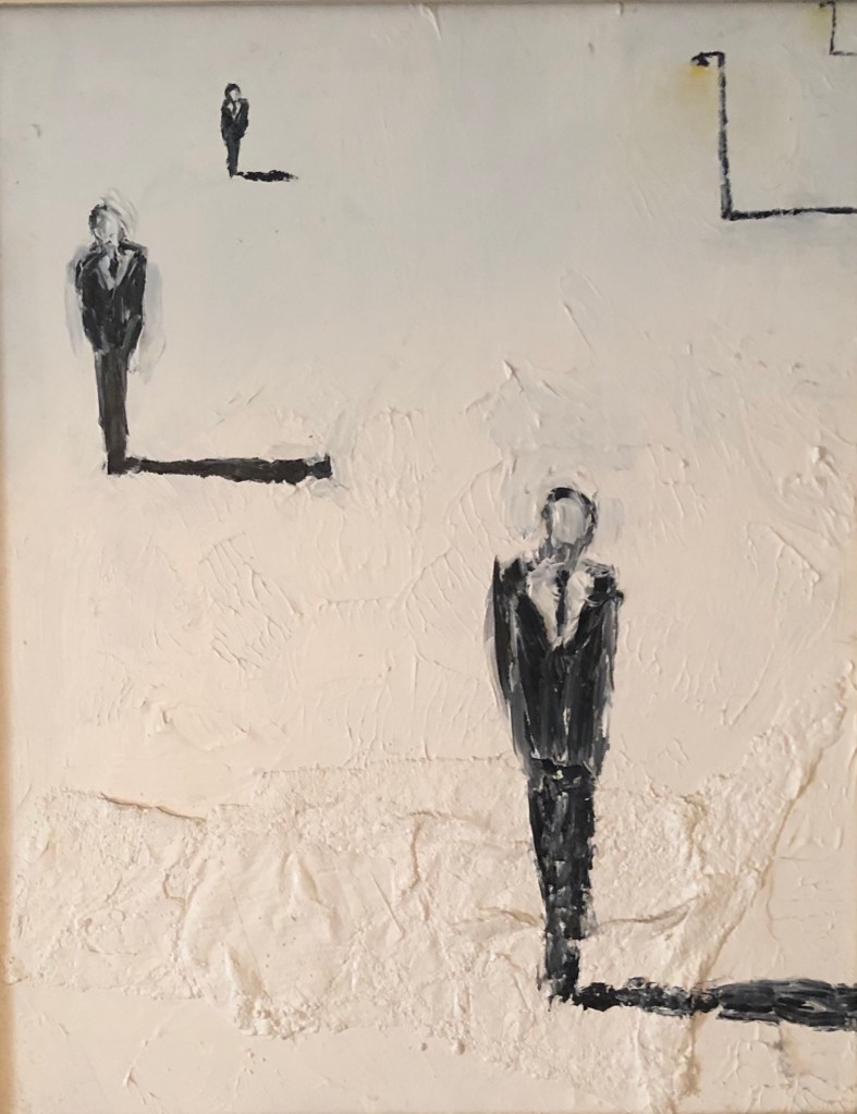 (2021) The man is a silhouette. Which direction he is facing is uncertain. If the man is walking towards the shadows, the piece becomes about choices and the paths we take to build who we are. But if he is walking away from his shadows it is about fate and how all roads lead to the same place.