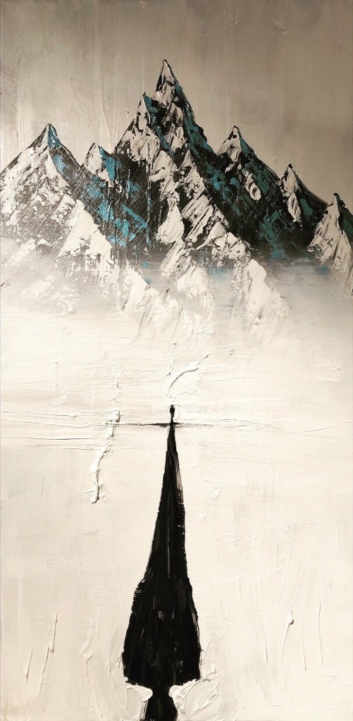 Mountains.. The great obstacle, are often used in my work as a metaphor for the goals and challenges we overcome in our life. The figure is cast beneath its goals and aspirations, but the larger shadow casts the lengths in which he has prepared to overcome them. Or is the figure past the mountains walking away with the shadow reflecting the legacy of what was overcome? But no matter where he ends up the plain in the beginning is the same as the end.