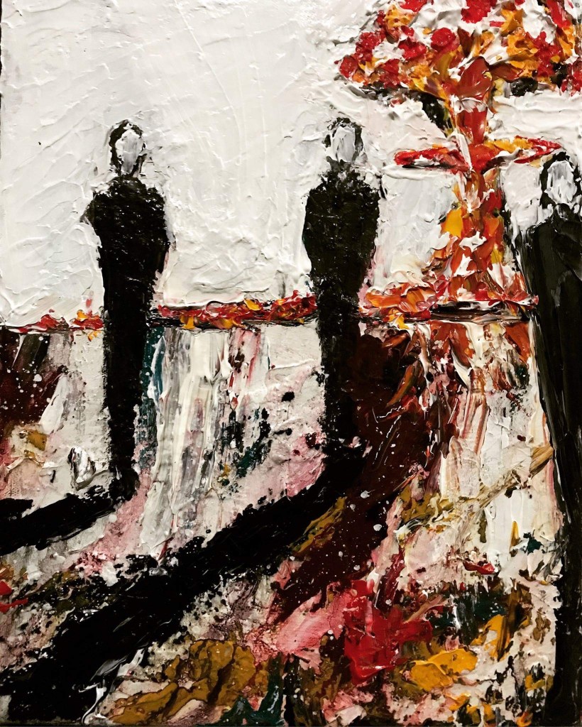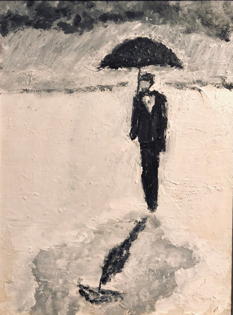2010 second year at Ottawa school of art. Painting with late artist Blair Sharpe (1954-2019). In this class my professor Blair Sharpe was quite the master of colour. He saw my tendency to be afraid of colour in our early stages of development, and pushed me to use more colour “just put a little bit, somewhere”. If you zoom in on the umbrella you may notice the gold dot at the top. However bit by bit I have developed my use of colour over the years and it has become one of my strengths.