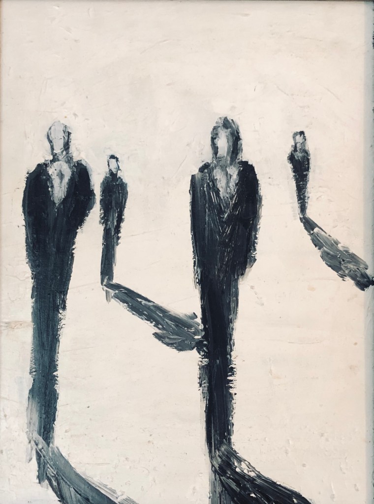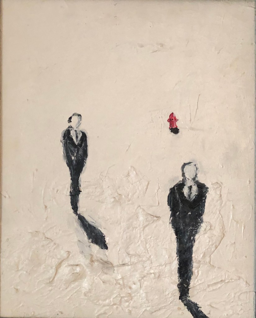 The separateness of human experience. The shadow-like figures are clad alike in suits. They occupy the same picture frame and yet all walk alone. Followed by their shadow. The dichotomies of inner and outer self, physical and spiritual, conformity and solitude all combine to convey the brutal enforcement of experience. That we may share the same space and time, but living and dying in our own worlds.